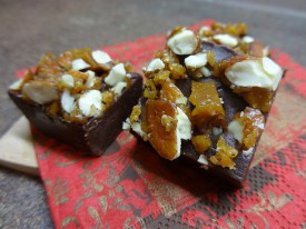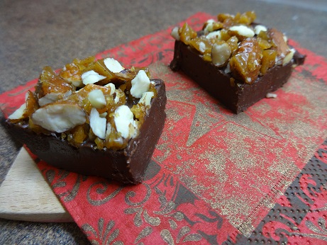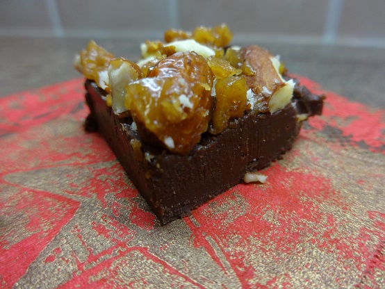 - Po úplném ztuhnutí mandle v karamelu nalámeme na menší kousky, které vložíme do uzavíratelného sáčku (anglicky ziploc bag) a například pomocí paličky na maso přes sáček rozdrtíme na libovolně velké kousky. Kousky zatím dáme stranou a připravíme si fudge.